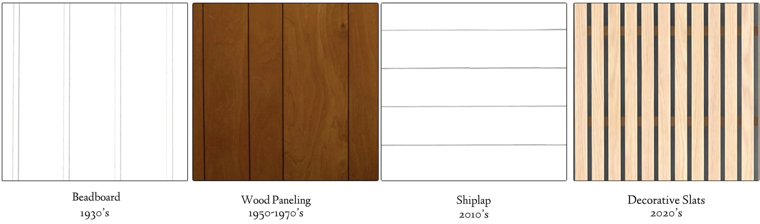 Remember wood paneling? Well, it has technically never gone away, it has been in transition for the last 50-100 years. We went from beadboard - wood panelling - Shiplap - slats - to whatever someone thinks of next. How it changes and evolves is what keeps it alive. There is always creativity behind every transition.